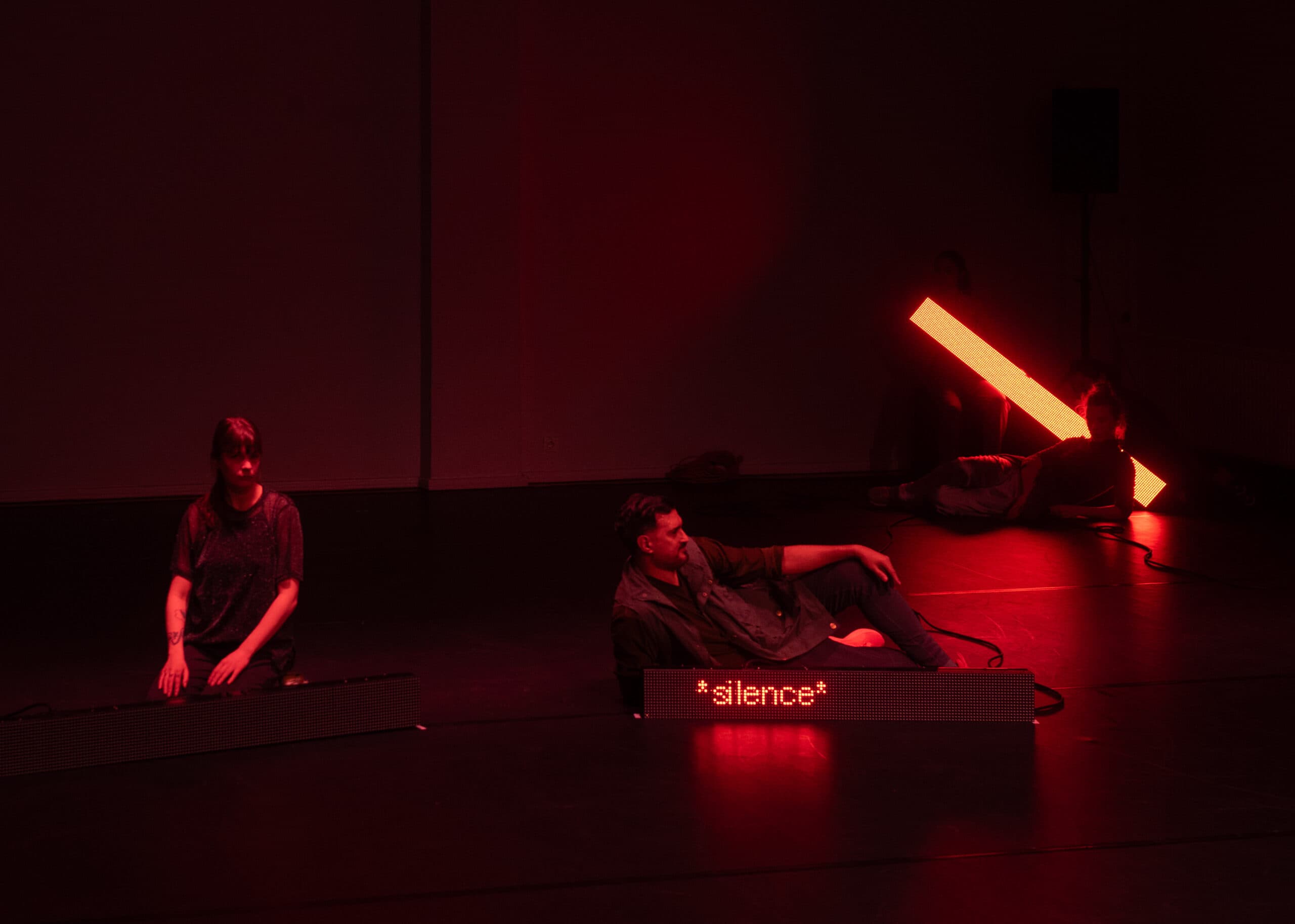 The LED-signs, usually encountered in public spaces as low-key advertisement signs, become means to explore how language keeps inscribing in our bodies. Navigating between kebab stand ads, tourism slogans and visa questionnaires the dancers, who themselves carry experiences of migration between countries, interact with the text scrolling on the LED panels.