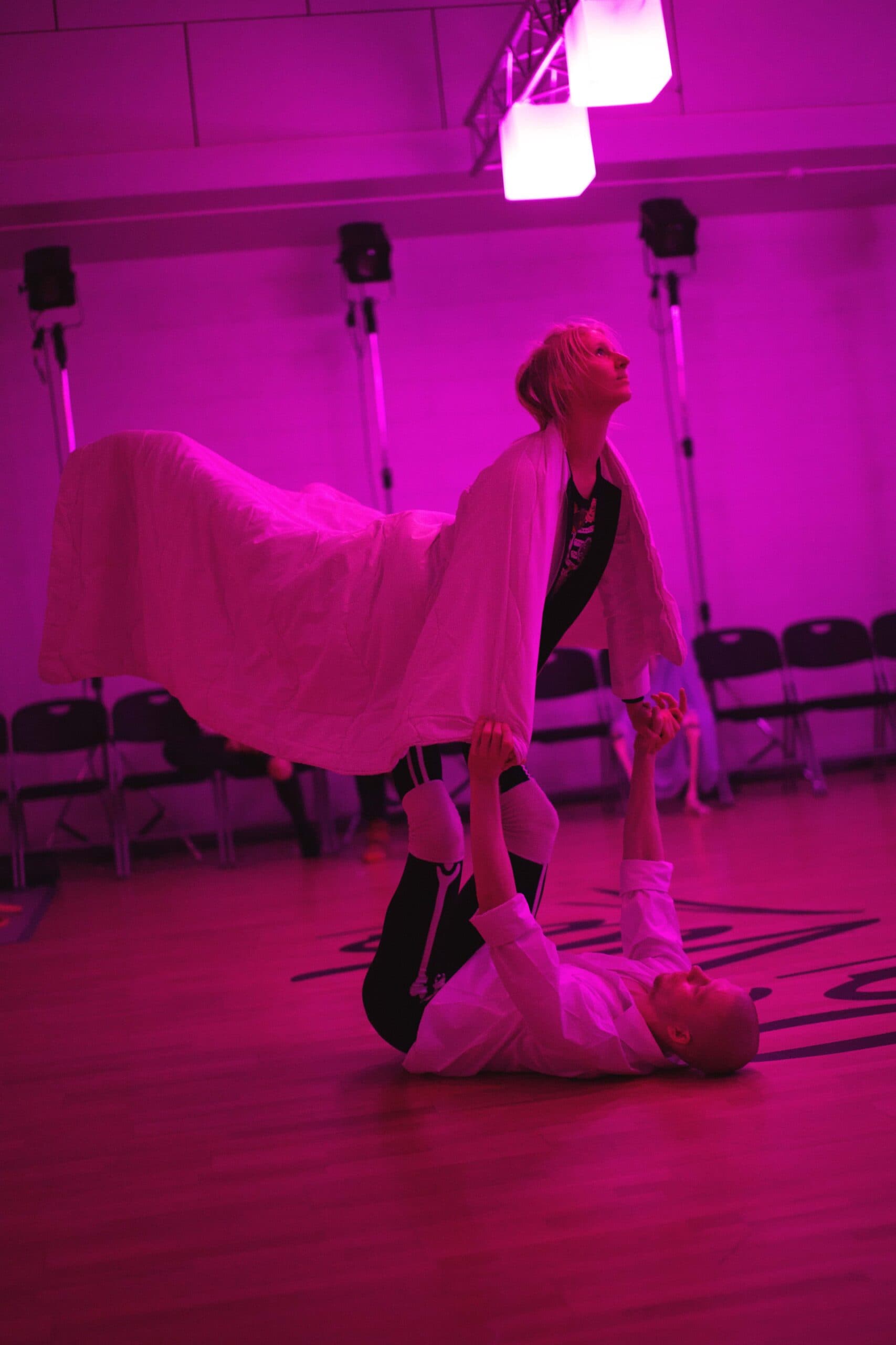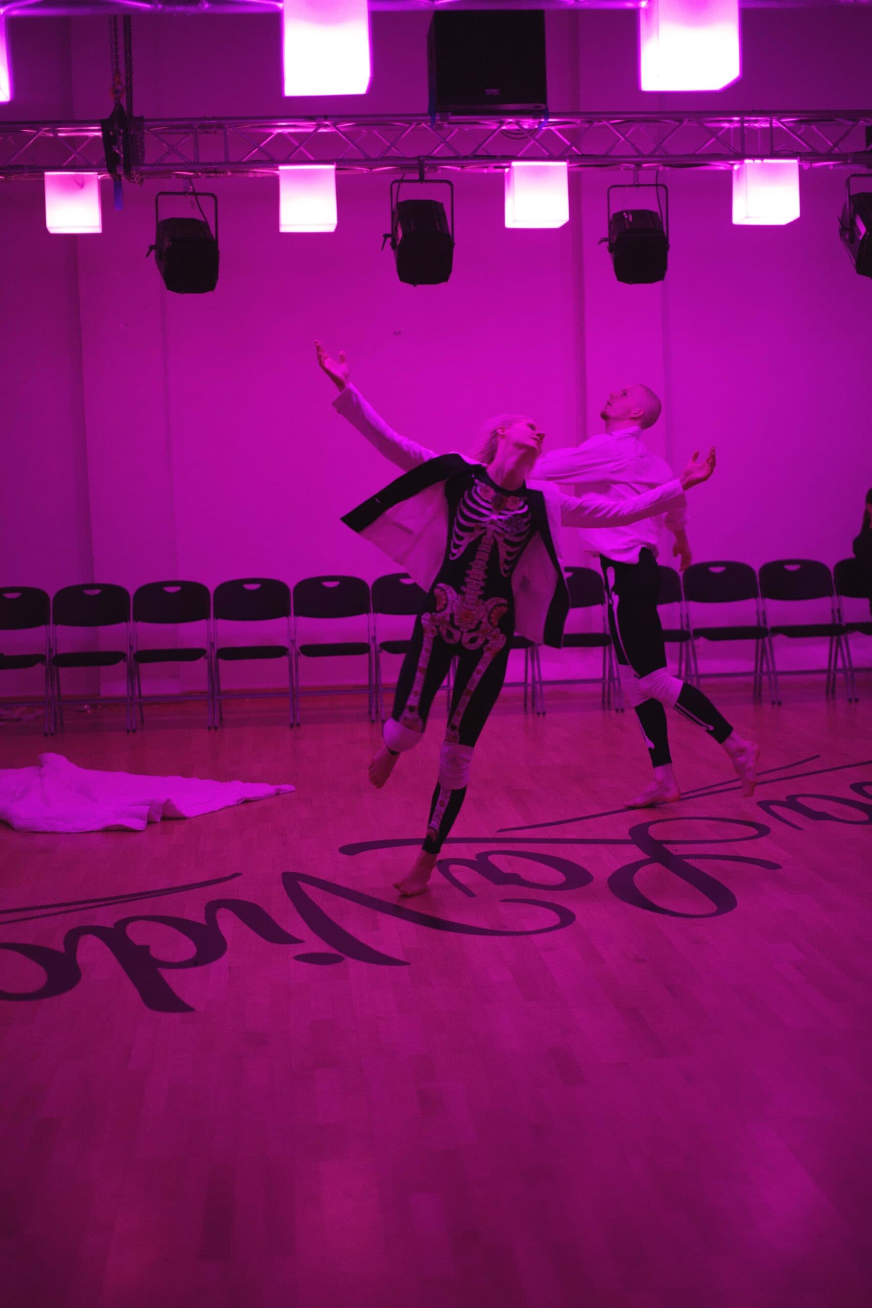 See mees ja naine, kes tantsivad suurel laval balletikingades.